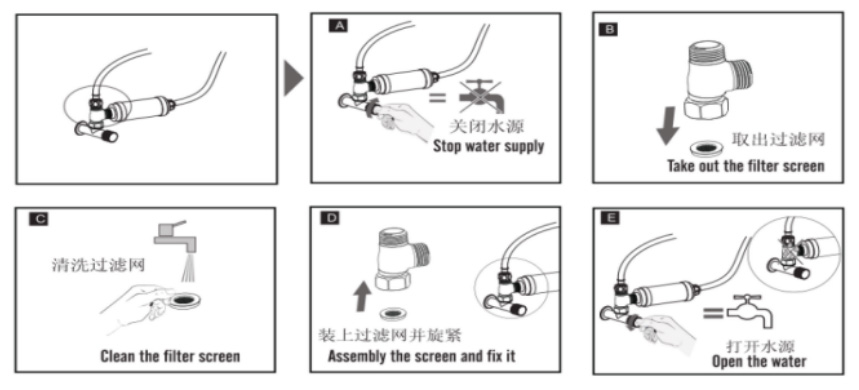 Countermeasures:Unplug the power and close the inlet angle valve. Unscrew the tee joint, remove and clean the filter screen, then reassemble and tighten the tee joint. Reopen the angle valve and plug the power. Refer to the following illustration.